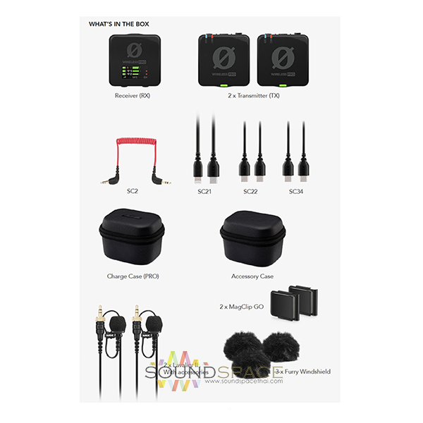 RODE Wireless PRO ชุดไมค์ไร้สายติดกล้องแบบไมค์คู่ 2 ตัว ต่อยอดจากความสำเร็จจาก Rode Wireless GO II ที่ประสบความสำเร็จในการเป็นผู้นำไมโครโฟน Wireless มาอย่างยาวนานด้วยไมโครโฟนรุ่นใหม่ล่าสุดอย่าง Rode Wireless Pro ที่มาพร้อมกับสินค้าในกล่องดังนี้
