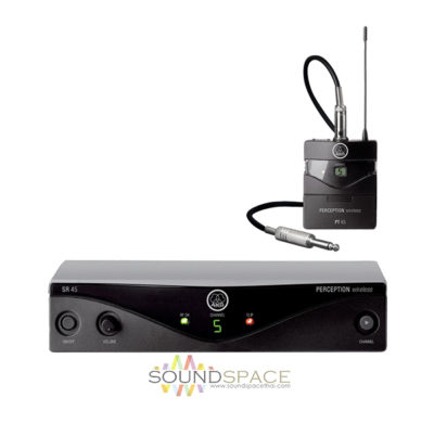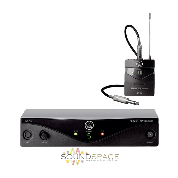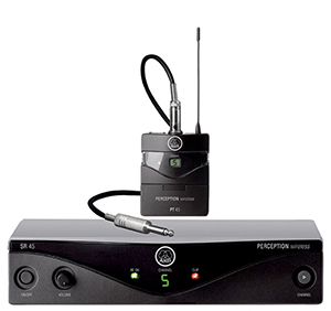 ชุดไวเลสกีตาร์แบบ UHF สำหรับเครื่องดนตรีกีตาร์และเบส AKG WMS45 Perception Wireless 45 Instrument Set, 30 MHz selection bandwidth, 8 hours of operation with a single AA size battery, Compatible with all AKG MicroMics, Complete with MKG L cable