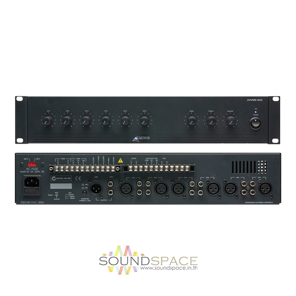 เครื่องขยายเสียงระบบเสียงประกาศ AUSMON 60W. Mixer Amplifier, 6 x dual balanced mic/line inputs. 100V, 70V & 4Ω & 8Ω outputs. 240VAC & 24VDC. 2RU