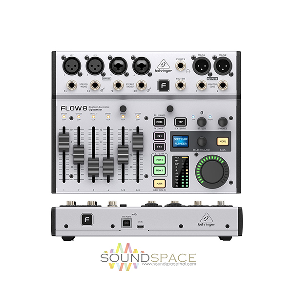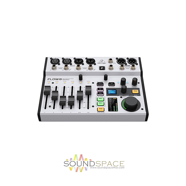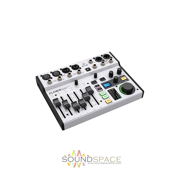 ดิจิตอลมิกเซอร์ BEHRINGER FLOW8 ขนาดเล็กพร้อมบลูทูธ 8-Input Digital Mixer with Bluetooth Audio and App Control, 60 mm Channel Faders, 2 FX Processors and USB/Audio Interface, All channels with 4-band EQ and compressor, 2 FX, and 2 monitor sends, Built-in 10 x 2 channel USB computer audio Interface, with 48 kHz / 24-Bit resolution