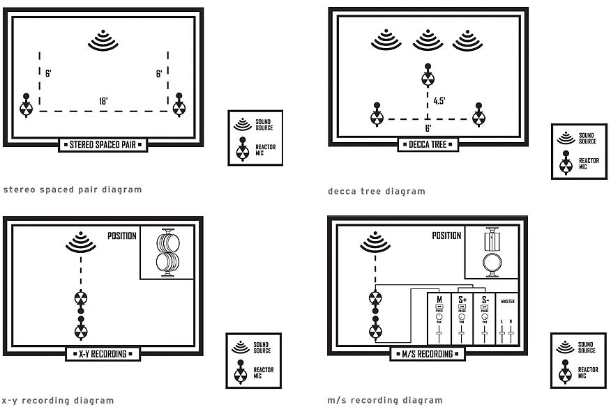 Reactor’s multiple pattern capabilities, swiveling head, and audiophile circuitry make it an excellent platform to use for exploring multiple microphone setups. There are many options of multi-mic configurations that have been created and refined in some of the world’s most sophisticated recording environments–from stereo spaced pairs to Decca Trees to effects multi-miking–each developed to capture an instrument, an ensemble, a vocal, or an ambient recording in a way which is both sonically intriguing and useful. The concept is relatively simple: combine the output of multiple microphones arranged in different ways to capture a totally new sound. We suggest using multiple Reactor microphones to