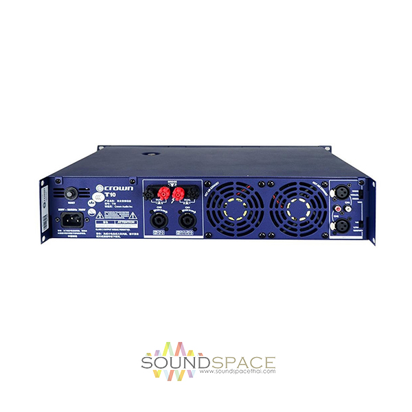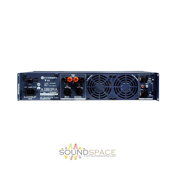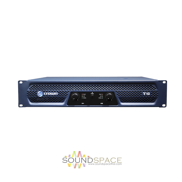 แอมป์ขยายเสียง CROWN T10 เป็นเครื่องขยายเสียงจาก CRORN ในตระกุล T-Series มีกำลังขับ 1350 วัตต์ x 2 ชาแนล ที่ 4 โอหม์, 1000 วัตต์ x 2 ชาแนล ที่ 8 โอหม์, ตอบสนองความถี่ 20Hz-20kHz, Input connector One balanced XLR connector or one unbalanced RCA connector per channel