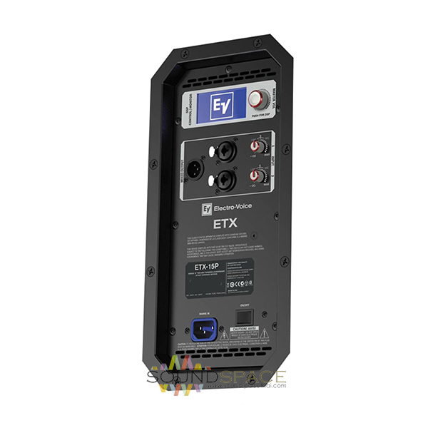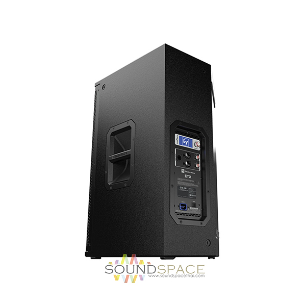 ตู้ลำโพง EV ETX-15P แบบมีกำลังขยายในตัว เป็นลำโพง Active ในตระกูล ETX Series, ดอกลำโพงขนาด 15 นิ้ว LF SMX woofer เสียงแหลม 1.25 นิ้ว HF titanium compression driver มีกำลังขยาย 2000 วัตต์ Class-D power amplifier with integrated FIR-Drive DSP