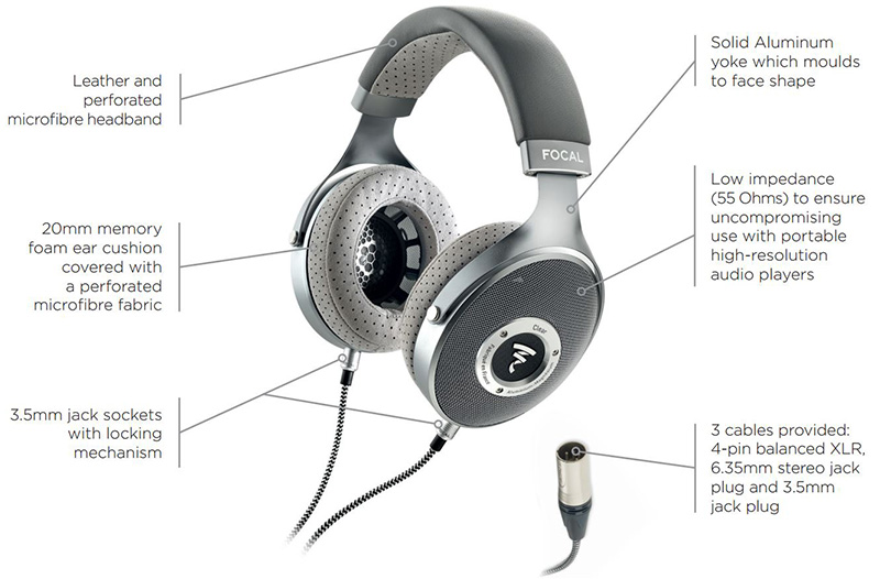 หูฟัง FOCAL CLEAR เป็นหูฟังแบบ Circumaural Open-Back Design, 40mm M-Shaped Dome Drivers, 20mm Thick Memory Foam Ear Cushions, 3.5mm Sockets with Locking Mechanism, ตอบสนองความถี่ 5Hz – 28kHz, Impedance 55 Ohms, Includes Two Detachable Cables, Hardshell Carry Case