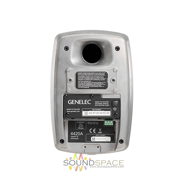 ลำโพงวูฟเฟอร์สตูดิโอมอนิเตอร์ Powered Smart IP GENELEC 4430 ARW สีอลูมิเนียม, ขนาดดอกลำโพง 4.1″ Woofer, 3/4″ Metal-Dome Tweeter, 100W Class-D Amplification, ใช้การเชื่อมต่อผ่านเครือข่าย IP (Audio over IP – AoIP) รองรับ PoE+, ซึ่งช่วยให้ส่งสัญญาณเสียง, พลังงานและการควบคุมผ่านสาย LAN เพียงเส้นเดียว