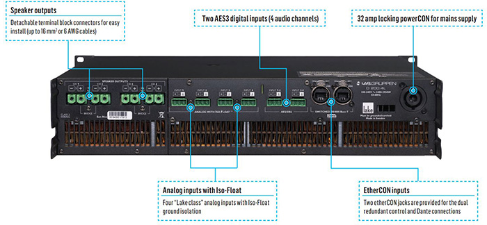 แอมป์ขยายเสียง (เพาเวอร์แอมป์) LAB GRUPPEN D80:4L, with Lake DSP, Up to 2000 W per channel for driving high power elements, 4 “Lake class” analog inputs with Iso-Float™ ground isolation, 4 AES inputs, 8 Dual Redundant Dante™ inputs, Breaker Emulation Limiter (BEL)