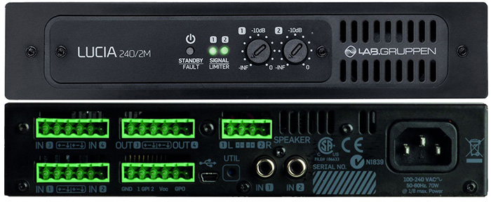 แอมป์ขยายเสียง LAB GRUPPEN LUCIA 240/2M, Incorporates Ease Of Install With 2 x 120 W into 8, 4 or 2 ohms, 4 x 4 mix matrix, Automatic Dynamic Loudness Contouring, Per channel presets for high-pass filter, parametric EQ, delay and look-ahead limiter