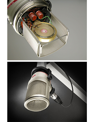 The microphone headgrille twists off for quick cleaning. In front of the capsule, mounted on a frame holder, a fine gauze serves as a built-in popscreen. The microphone has an elastic mount against structure-borne noise, that is compatible with standard broadcast-segment microphone arms.