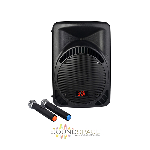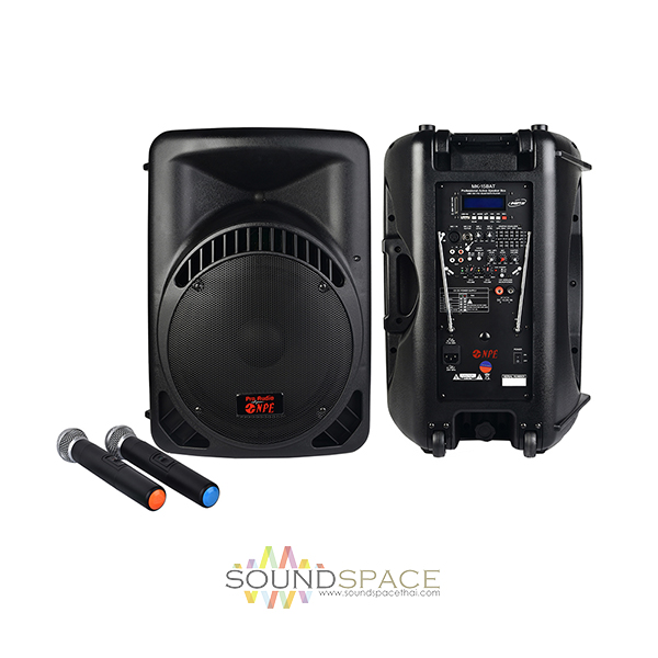 ชุดลำโพงล้อลากแบบมีแบตพร้อมไมค์ลอย NPE MK-15BAT, ขนาดลำโพง 15 นิ้วมีกำลังขับ 100 W @ 4 Ohm (500 W P.M.P.O), พร้อมไมค์ลอยย่านความถี่ VHF (190MHz – 240MHz) 2 ตัว, แบตเตอรี่ช้งานต่อเนื่อง 4 ชั่วโมง