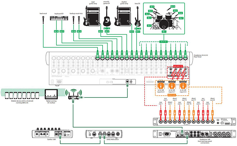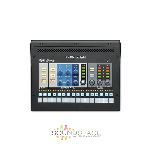 มิกเซอร์มอนิเตอร์ PreSonus EarMix 16M, 16×2 AVB-networked personal monitor mixer, 24-Bit / 48 kHz Operation, Drives Low-Impedance, In-Ear Monitors, Limiter and 3-Band EQ on All Channels, Stereo Channel Linking and Grouping, Support for PoE Power