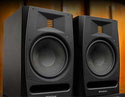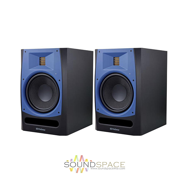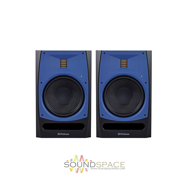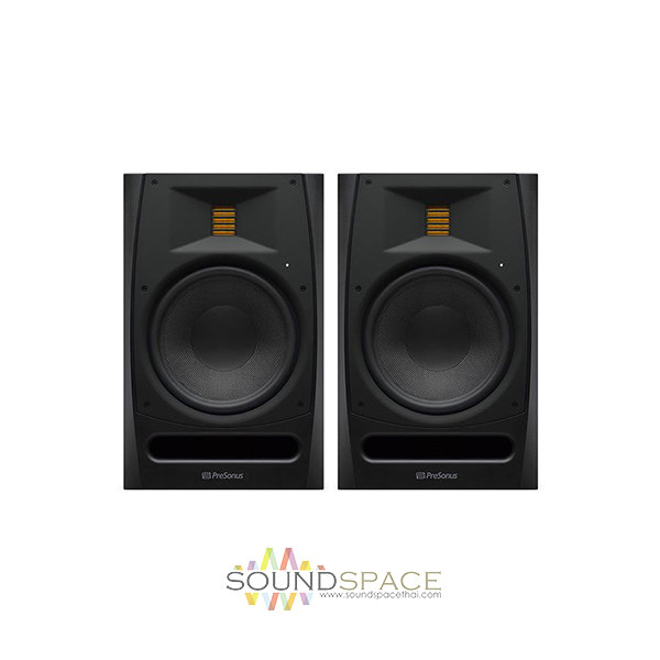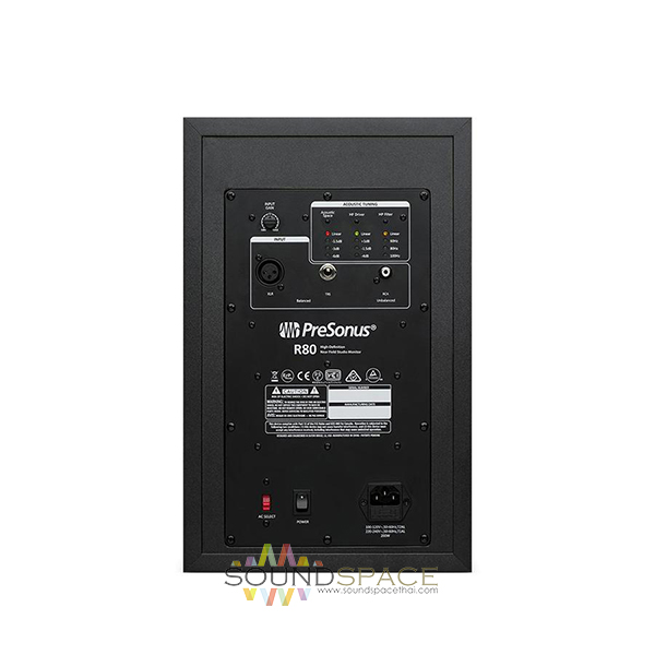ลำโพงมอนิเตอร์สำหรับห้องบันทึกเสียงแบบมีกำลังขยายในตัว PreSonus R Series R80 2-way active AMT design, ขนาดดอกลำโพง 8 นิ้ว Kevlar LF driver มีกำลังขับ  Bi-amped 150 วัตต์ RMS (LF = 100W, HF = 50W), Class D power amplifier with switching power supply ตอบสนองความถี่ 45 Hz to 22 kHz