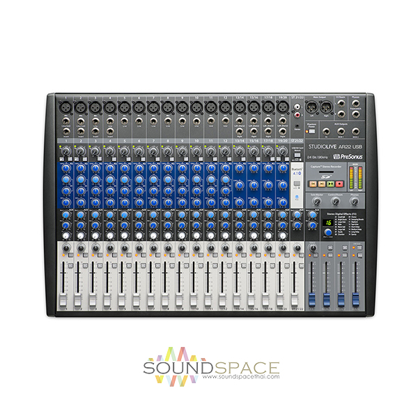 The PreSonus StudioLive AR22 USB is a 22-channel hybrid performance and recording mixer well suited for a variety of applications including mixing and recording live shows, studio productions, band rehearsals, podcasts, and more. The mixer is packed with analog connections and digital tools that are powerful, yet easy to learn and use. The mixer features Class-A preamps and 3-band EQ.