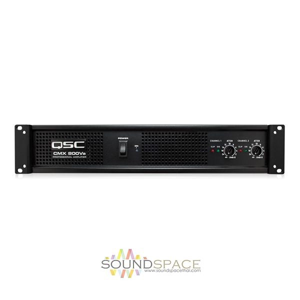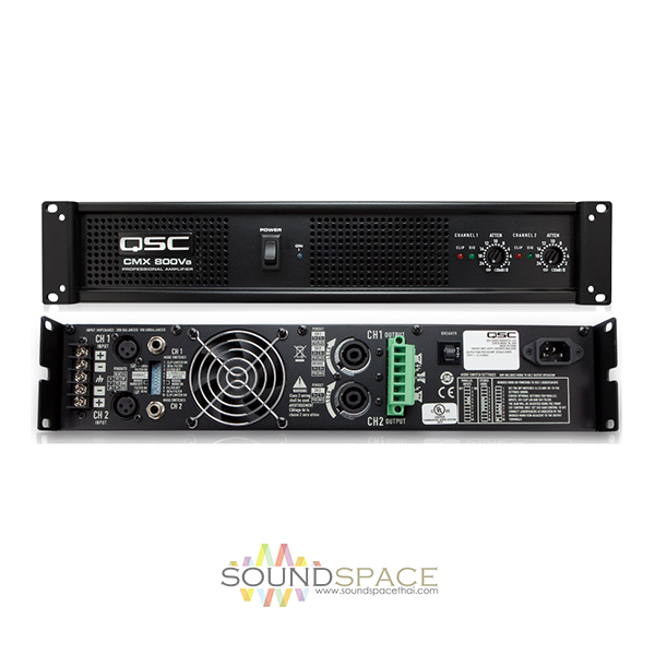เครื่องขยายเสียงรบกวน  QSC CMX800Va มีกำลังขับ 500 วัตต์ x 2 ที่ 8 โอหม์, 70 V mono 2000 วัตต์, class AB, DIP switches for easy selection of stereo, parallel, or bridged mode operation, Tamper-proof security cover for gain controls