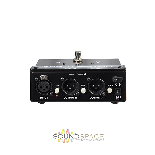 LED indicators display the active output, and the footswitch itself can be configured for latching or momentary action. While the HotShot 48V is specifically designed to address issues when switching condenser microphone outputs, it works equally well with dynamic mics also.