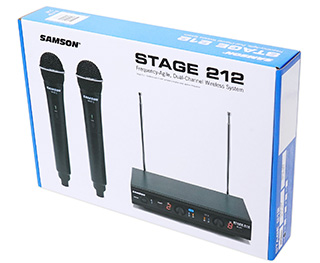 ไมโครโฟนไร้สายชนิดมือถือแบบไมค์คู่ 2 ตัว SAMSON Stage 212 เป็นชุดไมโครโฟนความถี่ย่าน VHF (173 to 198 MHz), ในชุดประกอบด้วยเครื่องรับ Samson SR212 Dual-Channel Receiver 1 เครื่อง, เครื่องส่ง ไมโครโฟน Samson VH212 Handheld Dynamic Microphones 2 ตัว, ใช้แบตเตอรี่ขนาด 9V. ได้นานต่อเนื่อง 10 ชั่วโมง, 12 operating channels, 60m operating range