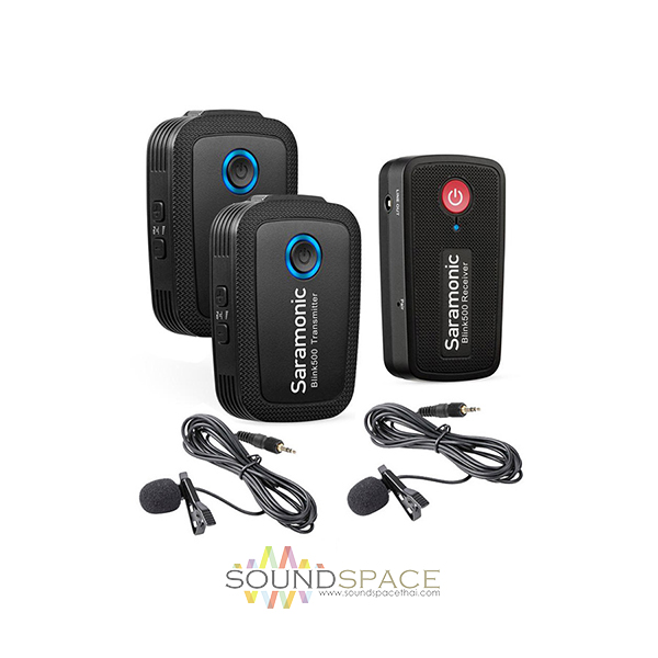 ชุดไมค์ติดกล้องไร้สายแบบไมค์คู่หนีบปกเสื้อสำหรับกล้องความถี่ 2.4 GHz Saramonic Blink 500 B2 สามารถใช้ไมค์พร้อมกันได้ 2 ตัว ในชุดประกอบด้วย ตัวรับสัญญาน Reciever RX (3.5 mm) 1 ตัว, ตัวส่งสัญญาน Transmitter TX 2 ตัว พร้อมไมโครโฟนหนีบปกเสื้อ 2 ตัว, ระยะรับส่ง 30 เมตร แบต Lithium แบบชาร์จได้ (ชุด B2ใช้กับ outputแบบ 3.5 mm)