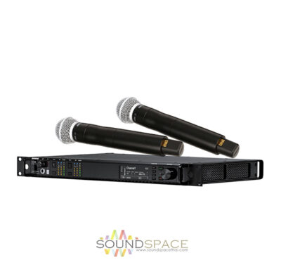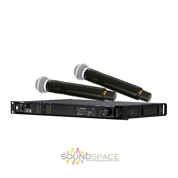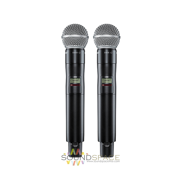 ชุดไมโครโฟนไร้สาย มือถือคู่ แบบดิจิตอล SHURE Axient AD24DA/SM58-P55, ในชุดประกอบด้วยเครื่องรับสัญญาน SHURE AD4DA แบบ 2 ชาแนล 1 เครื่อง, พร้อมเครื่องส่ง (ไมโครโฟน) SHURE AD2/SM58 โดยมีหัวไมโครโฟนเป็นรุ่น SM58 จำนวน 2 ตัว สามารถใช้งานพร้อมกันได้ 58 ความถี่