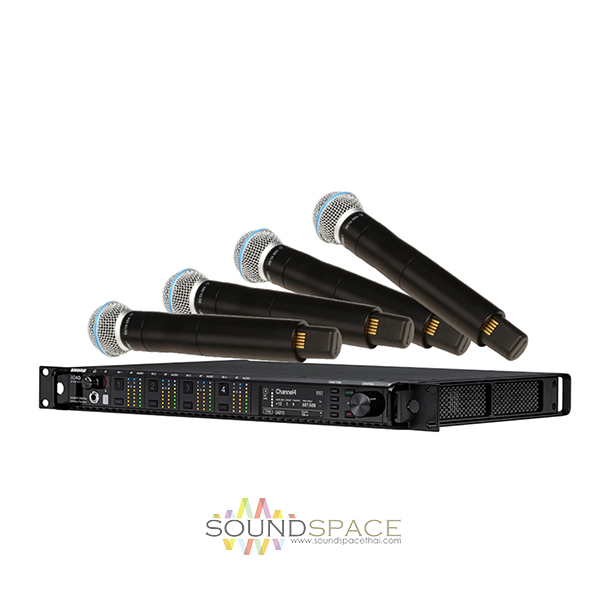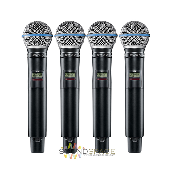 ชุดไมค์ลอยมือถือแบบดิจิตอล พร้อมไมค์ Beta58A จำนวน 4 ตัว SHURE Axient AD24QA/B58-P55 ในชุดประกอบด้วยเครื่องรับสัญญาน AD4QA แบบ 4 ชาแนล 1 เครื่อง, พร้อมเครื่องส่ง (ไมโครโฟน) AD2/B58 โดยมีหัวไมโครโฟนเป็นรุ่น BETA58 จำนวน 4 ตัว สามารถใช้งานพร้อมกันได้ 58 ความถี่