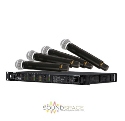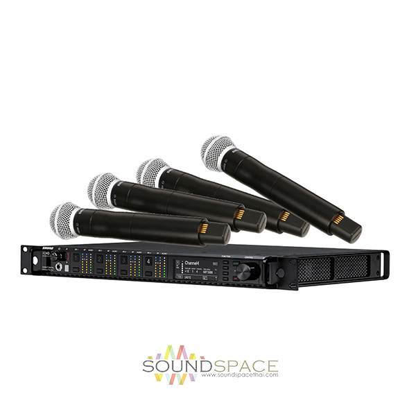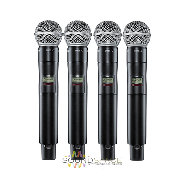 ชุดไมโครโฟนไร้สายแบบดิจิตอล พร้อมไมค์ SM58 จำนวน 4 ตัว SHURE Axient AD24QA/B58-P55 ในชุดประกอบด้วยเครื่องรับสัญญาน AD4QA แบบ 4 ชาแนล 1 เครื่อง, พร้อมเครื่องส่ง (ไมโครโฟน) AD2/SM58 โดยมีหัวไมโครโฟนเป็นรุ่น SM58 จำนวน 4 ตัว สามารถใช้งานพร้อมกันได้ 58 ความถี่