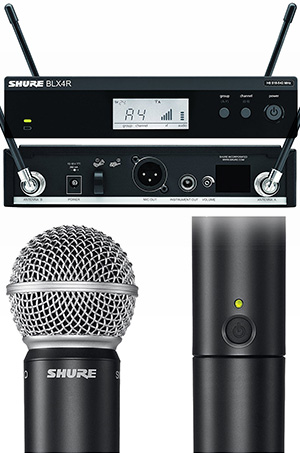 The BLX24R Handheld Wireless System with SM58 Mic from Shure includes a BLX4R rackmountable wireless receiver and a BLX2 handheld transmitter with an SM58 microphone. This system is set to Shure’s J10 frequency band between 584 to 608 MHz. The system has up to a 300′ line-of-sight range of operation and is designed for easy setup.