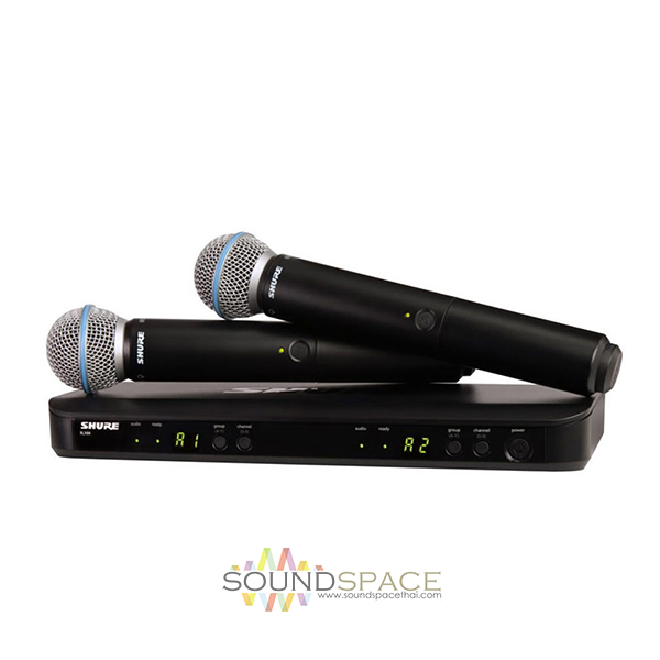 ไมค์ลอยแบบไมค์คู่ 2 ตัว ความถี่ใหม่ถูกต้องตามข้อกำหนดของ กสทช SHURE BLX288A/B58-M19 (694-703MHz) ประกอบด้วย เครื่องรับสัญญาณไมค์ BLX88 dual wireless receiver 1 เครื่อง, เครื่องส่งสัญญาณ BETA 58/BLX2 (ไมโครโฟนไร้สาย SHURE หัวไมค์เป็นรุ่น SHURE BETA 58) 2 ตัว