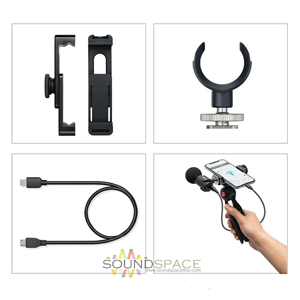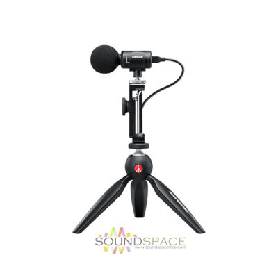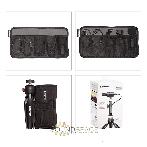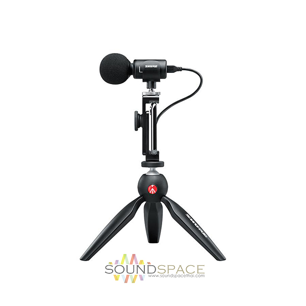 ไมโครโฟนสำหรับสมารท์โฟน (iOS, Android) พร้อมขาจับและอุปกรณ์ Shure MOTIV MV88+ Video Kit ในชุดประกอบด้วย ไมโครโฟน shure mv88+ ขาจับManfrotto Tripod/Grip with Ball Head, 24-Bit / 48 kHz Mono/Stereo Recording, Real-Time Headphone Monitoring