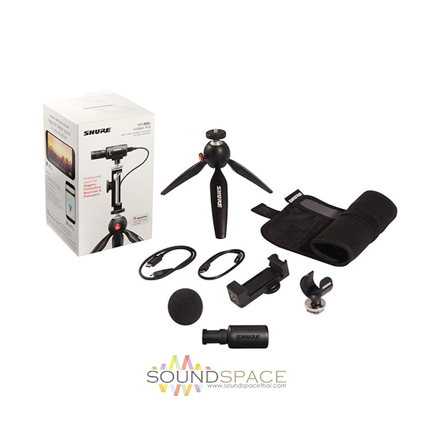 ไมโครโฟนสำหรับสมารท์โฟน (iOS, Android) พร้อมขาจับและอุปกรณ์ Shure MOTIV MV88+ Video Kit ในชุดประกอบด้วย ไมโครโฟน shure mv88+ ขาจับManfrotto Tripod/Grip with Ball Head, 24-Bit / 48 kHz Mono/Stereo Recording, Real-Time Headphone Monitoring, Filmic Ready, MOTIV Audio/Video App