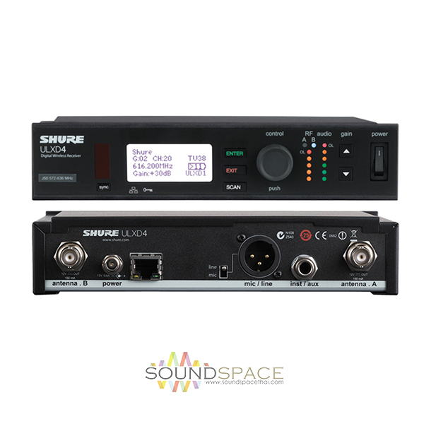 ชุดไมโครโฟนไร้สายแบบมือถือชนิดไมค์เดี่ยว Shure ULXD24A/B58 M19 (694-703 MHz) ในชุดประกอบด้วยเครื่องรับสัญญาณไมค์ ULXD4 receiver 1 ตัว, เครื่องส่งสัญญาณ ULXD2 Transmitter with BETA58 capsule (ไมโครโฟนไร้สาย SHURE 1 ตัว หัวไมค์เป็นรุ่น BETA58)
