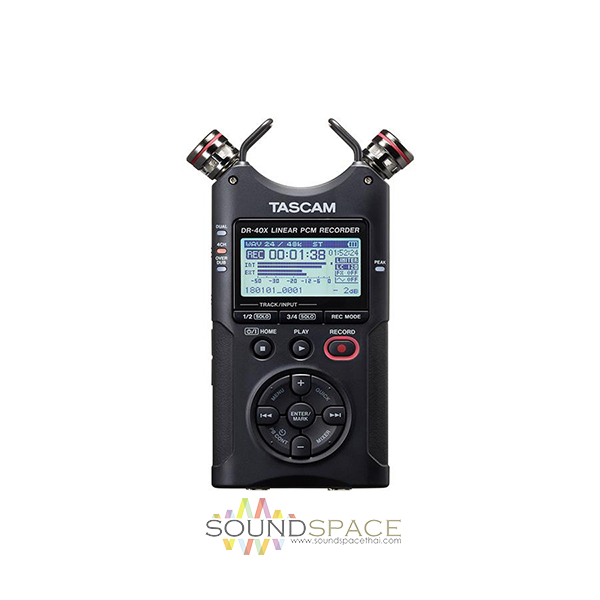 เครื่องบันทึกเสียงดิจิตอลแบบเสียงพกพาแบบ 4-Track Tascam DR-40X, 4-Channel Multi-Track Recording, 2-In/2-Out USB Audio Interface, 2 x Unidirectional Stereo Condenser Mics, XLR/TRS Combo Inputs, Dictation Mode with Speed Control and EQ, One-Touch User Interface