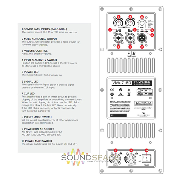 ลำโพงแบบมีกำลังขยายในตัว VL AUDIO VIVA-715D เป็นตู้ลำโพงขนาด 15 นิ้ว เสียงแหลม 1 นิ้ว Compression Driver มีแอมป์ขยายในตัว 2 ชาแนลและ DSP Processing กำลังขับสูงสุดรวม 1,400 วัตต์ และตั้งได้ถึง 6 Preset มาพร้อมเทคโนโลยี FiR LINEAR PHASE ความดังสูงสุด 136dB
