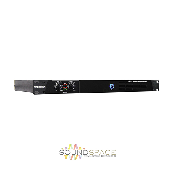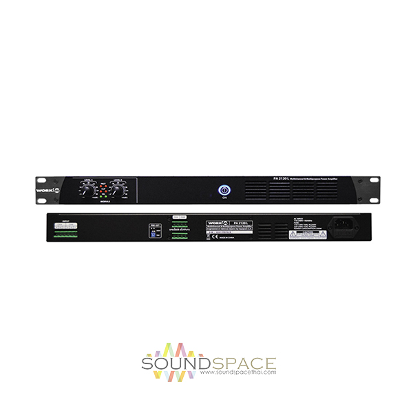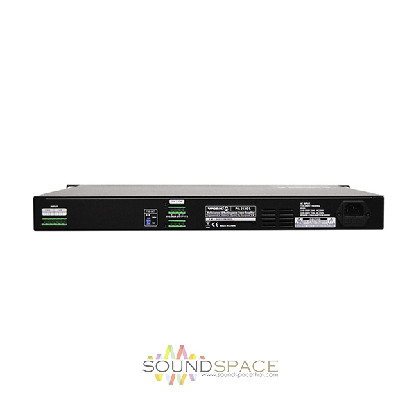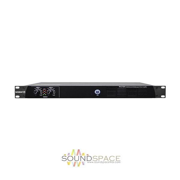เครื่องขยายเสียง WORK PA 2120L 70/100 V line แบบ 2 ชาแนลสำหรับงานระบบประกาศ, Class D มีกำลังขยายชาแนลละ 120 วัตต์, Switch mode power supply, 70 / 100V operation selectable, Volume control on each channel, Euroblock connectors, 1 HU rack 19 inch