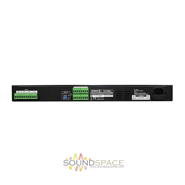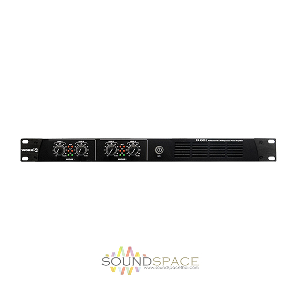 เพาเวอร์แอมป์ WORK PA 4500L 70/100 V line แบบ 4 ชาแนลสำหรับงานระบบประกาศ, Class D มีกำลังขยายชาแนลละ 500 วัตต์, Switch mode power supply, 70 / 100V operation selectable, Volume control on each channel, Euroblock connectors, 1 HU rack 19 inch