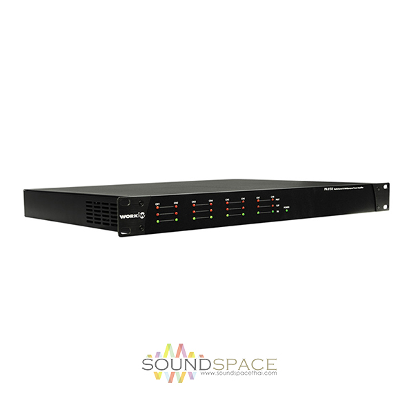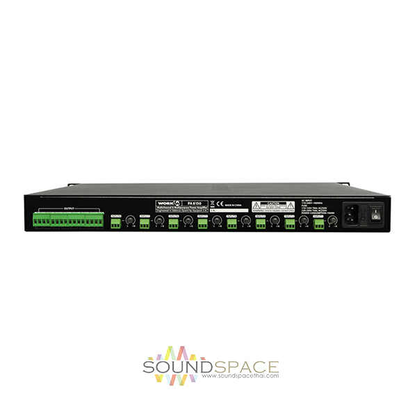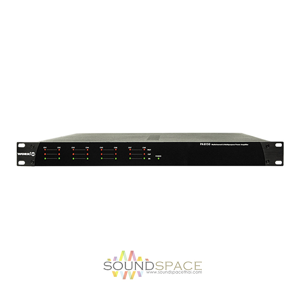 เครื่องขยายเสียง WORK PA 8150 แบบ 8 ชาแนล เป็นเพาเวอร์แอมป์แบบ Impedance Switching Class D amplifier, มีกำลังขับชาแนลละ 150 วัตต์ ที่ 4 Ohm, Signal, clip and protection indicators, Euroblock connectors for input and output, 1 rack unit